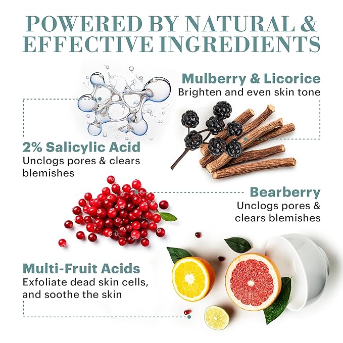 - Natural Ingredients for Smoother Skin: Infused with powerful fruit acids and skin smoothing agents like mulberry and licorice.