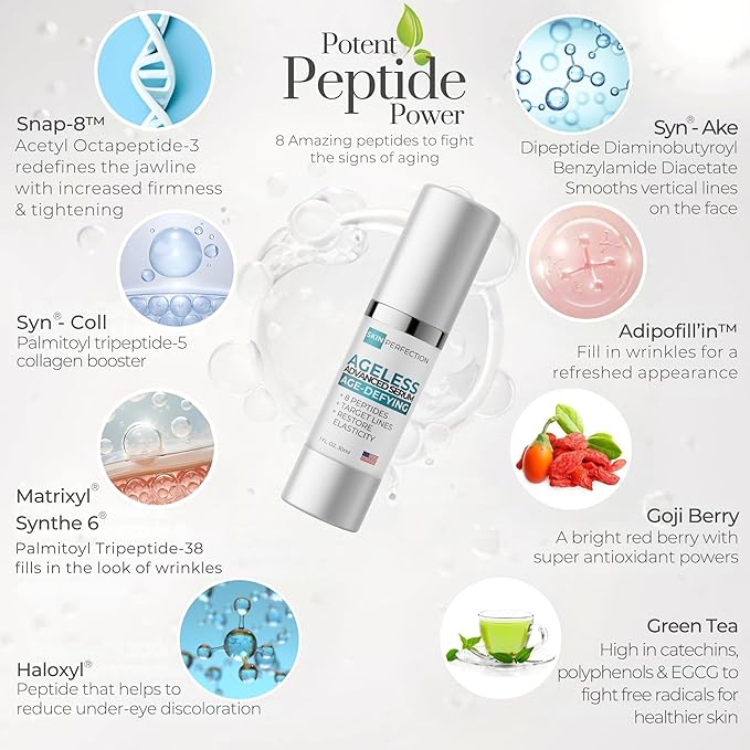 Skin Perfection Ageless Advanced Age-defying Serum Anti-aging Peptides Snap 8 Adipofill Matrixyl Synthe 6 Skin Firm Dipeptide Syn-ake Syn-coll Dmae Haloxyl Hyaluronic Acid