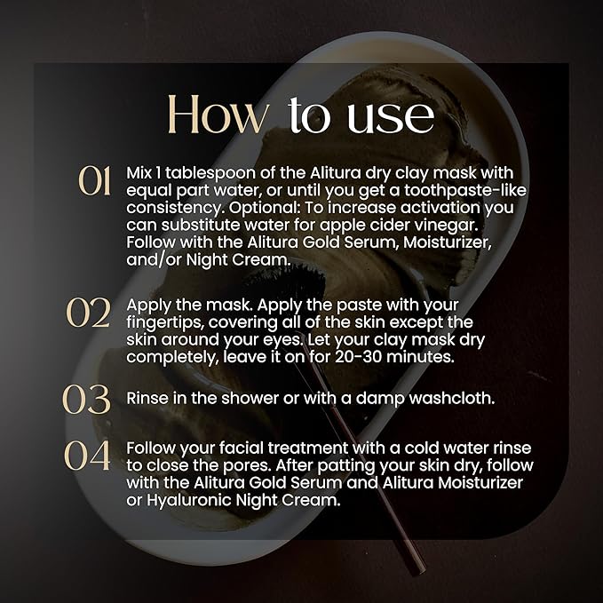 - How to Use for Best Results - In a non-metal bowl, mix 1–2 tablespoons of the clay mask with equal parts water until a smooth, creamy paste forms. Apply evenly to clean skin using fingertips or a brush. Leave on for 20–30 minutes or until fully dry. Rinse thoroughly with warm water, then finish with a splash of cold water to help close pores. Use 1–2 times per week for optimal results.