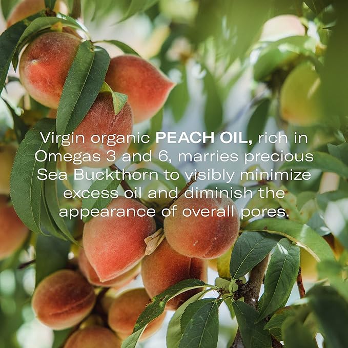 - Ingredient Power: Virgin Organic Peach Oil, rich in Omegas 3 and 6, marries precious Sea Buckthorn, renowned as the holy fruit of the Himalayas, to visibly minimize excess oil and diminish the appearance of overall pores. The astringent properties of Cypress and Grapefruit Oil work together to establish the look of a matte and pimple-free complexion.