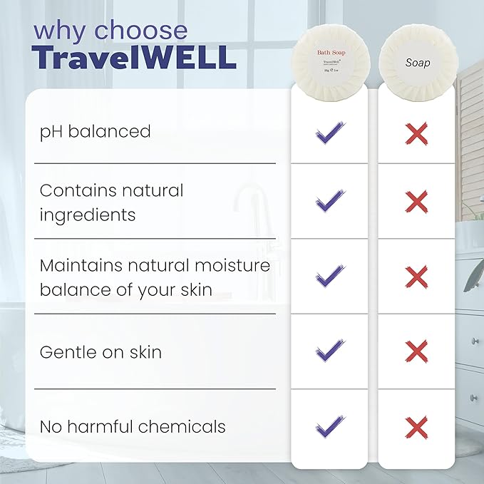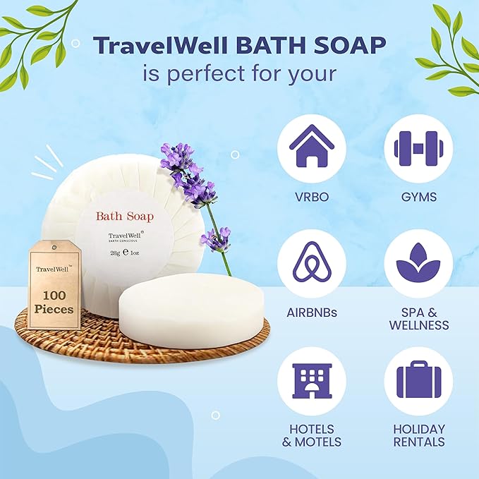 - Versatile Travel Toiletries: Travel Well offers a comprehensive bulk set of bath soap for diverse settings, such as hotels, vacation rentals, and spas. These mini bar soaps provide a luxurious touch to any hospitality service, enhancing the guest experience