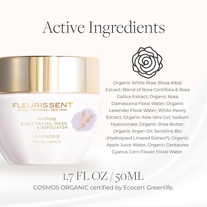 Fleurissent Serenity Elixir Lavender 2-in-1 Facial Mask & Exfoliator – Calming Fusion Florale-6, Organic Roses & Gentle Rice Exfoliation, 98% Natural, 1.7 FL OZ for Healthy-Looking Skin