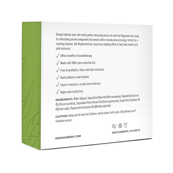 - PURE PLANT-BASED INGREDIENTS- Indulge in the purity of our Peppermint bar soap, crafted with the finest plant-based ingredients. This essential oil soap is free of synthetics, fillers, and harmful chemicals, ensuring a pure and clean wash. Made with Olive oil, Coconut oil, sustainable Palm Kernel oil, and wild Soybean oil, our vegan and cruelty-free soap is handcrafted in small batches. Embrace a luxurious cleansing experience with this premium aromatherapy soap.