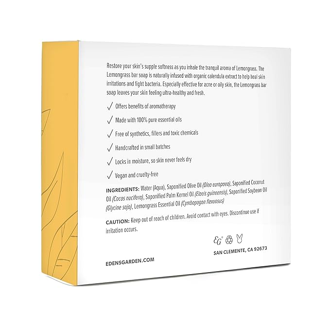 - PURE PLANT-BASED INGREDIENTS- Indulge in nature's goodness of our Lemongrass bar soap, made from high-quality plant-based ingredients and free of synthetics, fillers, and harmful chemicals. This essential oil soap is crafted with saponified Olive oil, Coconut oil, sustainable Palm Kernel oil, and wild Soybean oil, combined with pure Lemongrass essential oil. Handcrafted in small batches, this vegan and cruelty-free soap offers a premium aromatherapy experience, nurturing your skin with the finest botanical ingredients.