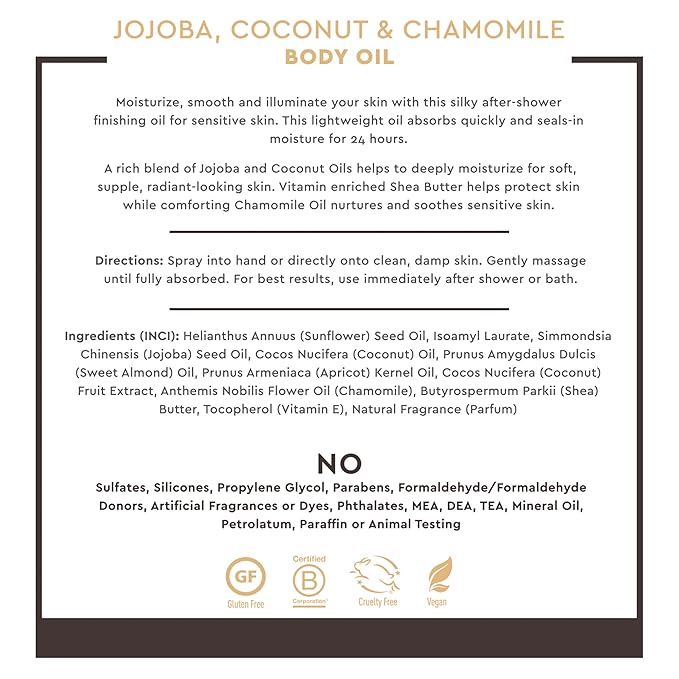 - Clean Beauty Promise: This body oil spray is Vegan, Cruelty-Free, and made without sulfates, parabens, or artificial fragrances. Proudly formulated in the USA and certified by B-Corp to meet the highest standards of social and environmental impact.