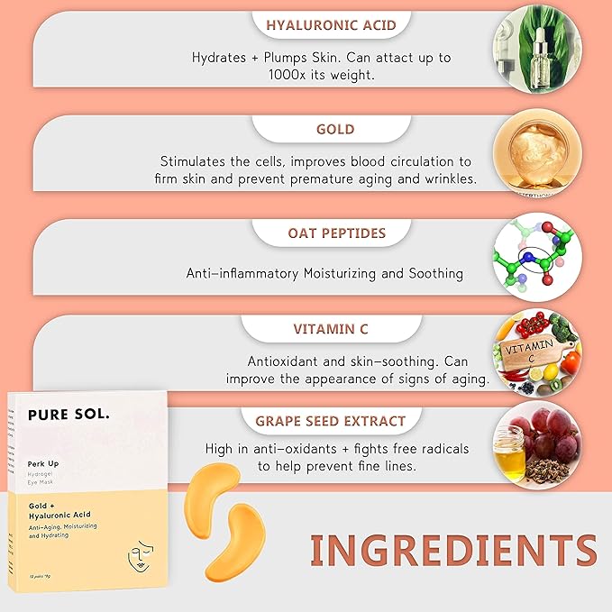 - ★ STAYS IN PLACE: You are busy and that is why we formulated Pure Sol collagen under eye gel patches to not slip. Leave eye gel pads in the fridge for an extra cooling and depuffing. Keep a couple eye masks in your bag for when you need a pick me up on the airplane or car ride.
