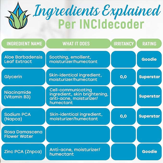 - PREMIUM INGREDIENTS include organic Aloe vera & Glycerin, Bioidentical vitamin Niacinamide, Sodium PCA & Zinc PCA with natural Rose water hydrosol. Beneficial for itchy skin, acne, oiliness, inflammation, psoriasis, sunburn and tattoo care.