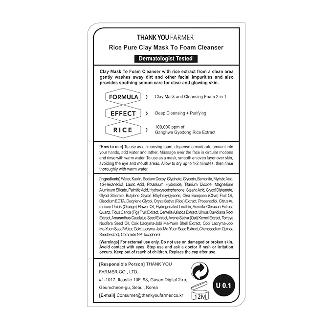 THANKYOU FARMER Rice Pure 2-IN-1 Korean Clay Mask to Foam Cleanser 5.27 fl.oz, Removes Excess Oil, Removing Dead Skin Cells, Soft Skin, Pore Purifying, Dermatologist Tested Korean Face Wash