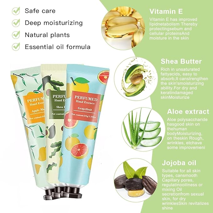 - 【10 Pack Fruits Fragrance Hand Cream】 10 Pleasant Fragrances: Freesia, Rose, Lily, False Acacia, Green Tea, Apple Mango, Juicy Peach, GrapeFruit, Wild Berry, Shea Butter. Pick and choose your favorite scent based on your mood at the moment from our 10 natural fragrances.
