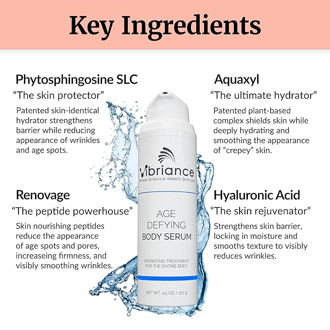 - Effective skin rejuvenation - Vibriance body serums are formulated with high-end trademarked ingredients to target wrinkled, thin, rough, dry, sagging, and crepey skin. They provide intense hydration and revitalization, ensuring your skin stays moisturized long after application.