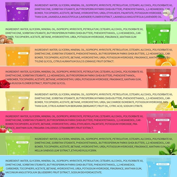 - 8 PLANT FRAGRANCE: Including shea butter, lavender, rose, lemon, strawberry, green tea, blueberry, and orange fragrance hand cream. Scent does not repeat a week. The hand lotion has a light fragrance and is easy to absorb but not greasy.