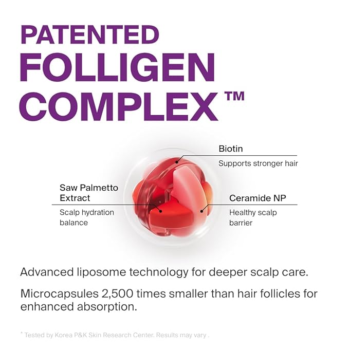 - Folligen Complex for Scalp Care: Our patented Folligen Complex supports scalp strength and elasticity while promoting thicker, fuller-looking hair. With particles 25,000 times smaller than pores, active ingredient absorption is maximized.