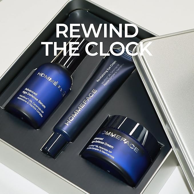 HOMMEFACE Men’s Advanced Age Defense 3-Piece Anti-Aging Skincare Set - Facial Serum, Eye Cream & Face Cream - Korean Skincare Technology with Volufiline, Ceramide, Hyaluronic Acid & Peptides
