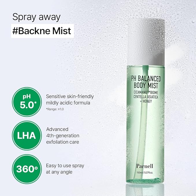 Parnell Cicamanu pH Balanced Body Mist - Centella Asiatica, Hyaluronic Acid, Ceramide, LHA, PHA, Mild Exfoliating, Soothing and Moisturizing Mist for Body, Back Acne and Bacne (5.07 Fl Oz / 150ml)