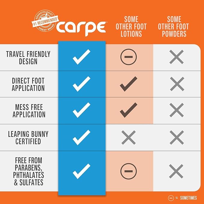 - REDUCE SWEAT AND STANK: With a dime-sized amount of Carpe Sweat Absorbing Lotion you can reduce sweaty feet without the downsides of oral treatments or iontophoresis. Apply every night and as needed and say goodbye to your sweaty, stinky feet.
