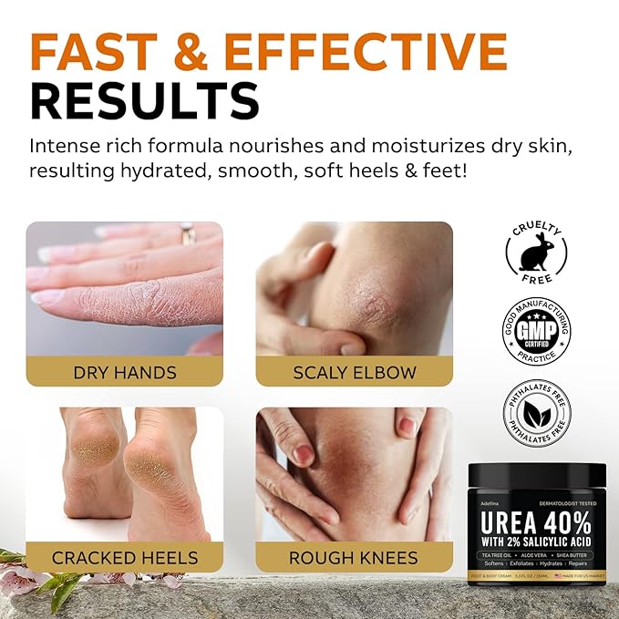 - Premium Ingredients - This highest potency Urea Cream 40% for feet, hands, elbows, nails intensively and quickly moisturizes, softens and smooths thick, callused, scaling skin. This foot hand repair cream is enriched with Tea Tree Oil, Aloe Vera, Shea Butter.