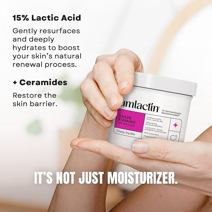 - Our formula: AmLactin’s crepe skin firming cream uses 15% lactic acid, a gentle yet effective AHA, to exfoliate dead skin cells and promote skin cell turnover; ceramides retain moisture and support the skin barrier to restore natural radiance