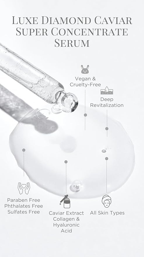 - 100% VEGAN, CRUELTY FREE, PARABEN FREE - The Luxe Diamond Caviar Super Concentrate Serum Targets Long Lasting Revitalizing Anti-Aging Properties For All Women And Men. A Must-Have For All Skin Types, The Luxe Diamond Caviar Collection Is Formulated Without Parabens, Phthalates, Sulfates And It is 100% Vegan & Cruelty-Free. Glow With Confidence And Celebrate Your Authentic Beauty By Repairing, Restoring, And Regenerating Your Skin To Create Perpetual Vitality And Luminosity.