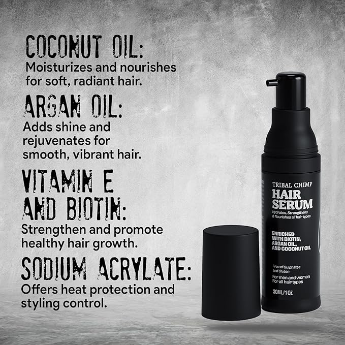 - Revitalize and Strengthen Hair: Tribal Chimp Hair Serum is the ultimate hair serum for growth, designed to restore vitality to dry damaged hair. With powerful ingredients like argan oil and coconut oil, this hair serum helps revitalize and strengthen strands from root to tip.