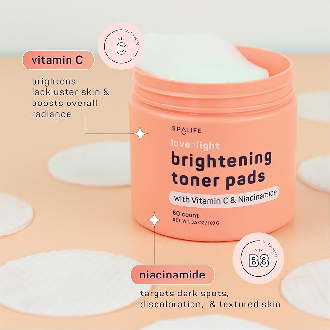 SpaLife Love & Light Radiating Toner Pads – for Uneven Skin Tone, Dark Spots & Discoloration, Clogged Pores, Dullness with Vitamin C, Niacinamide – Toner Pad for Face, Pre-Soaked Pads