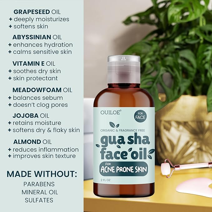 Gua Sha Oil for Face - Lymphatic and Anti Aging Facial Oil for Gua Sha Massage - Safe for Acne Prone Skin - Organic, Non Comedogenic, Fragrance Free, Lightweight - Use with Guasha Facial Tools, 2oz