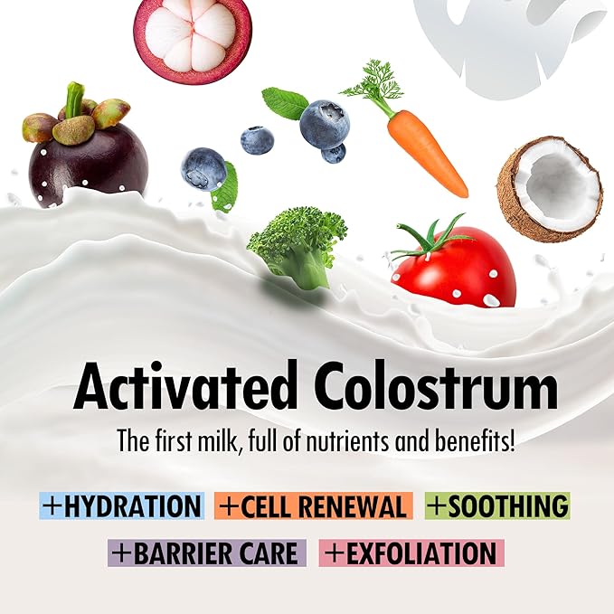 - ADVANCED COLOSTRUM COMPLEX.Enhance your skincare routine with the unique Activated Colostrum Complex in our sheet face masks, featuring 82 Bioactive ingredients. This complex supports hydration, cell renewal, and soothing, providing an ethical and effective skincare option.