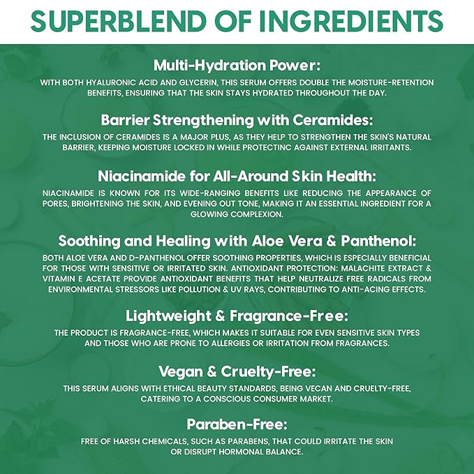 - Hyaluronic Acid Serum: The Hyaluronic acid serum is formulated with 2% pure Hyaluronic acid, which is a powerful hydrator that helps plump and hydrate the skin. Hyaluronic acid also helps reduce the appearance of fine lines and wrinkles by filling in the gaps between skin cells. This serum also contains vitamin E, which is an antioxidant that helps protect the skin from damage caused by free radicals.