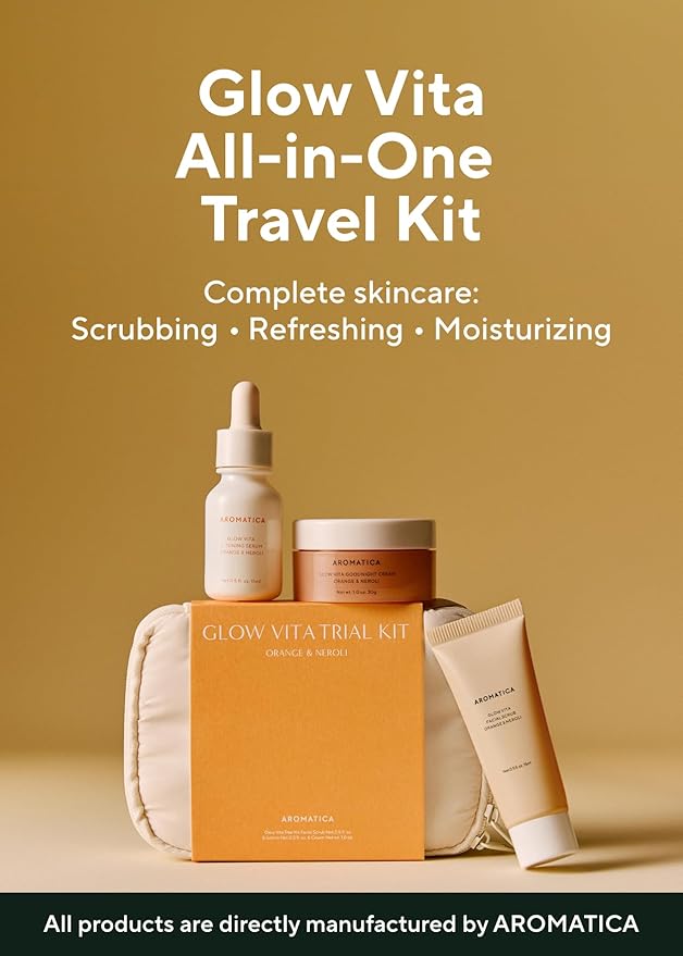 AROMATICA Glow Vita Trial Kit - Travel Size Skin Care Set [Vitamin C Serum 0.5 fl. oz, Facial Scrub 0.5 fl. oz, Goodnight Cream with Retinol 1oz] - Travel Kit for Women
