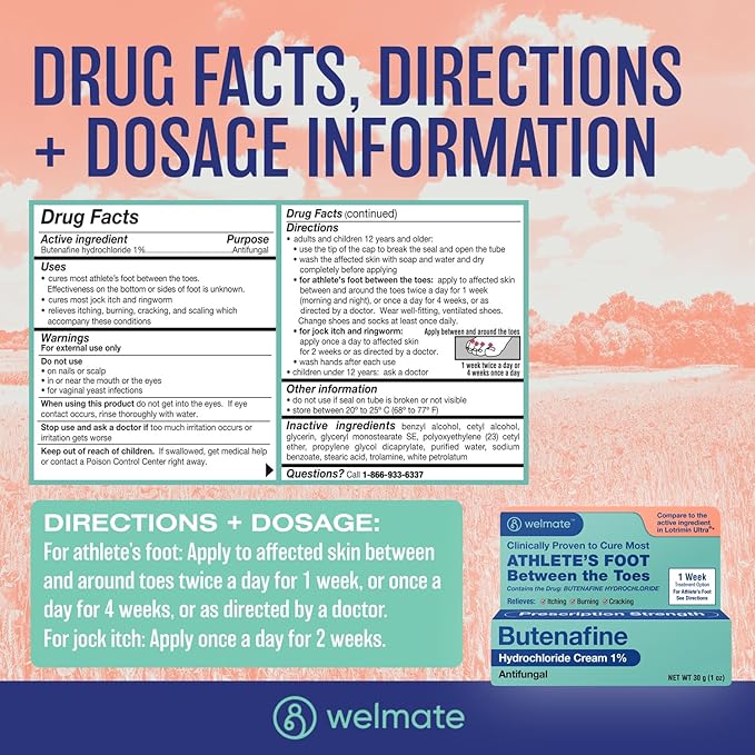 WELMATE - Athletes Foot Treatment Extra Strength - Antifungal Cream - Butenafine Hydrochloride - Relief from Ringworm, Athlete's Foot & Jock Itch - Foot Care - Nail Fungus Treatment for Toenail - 1oz