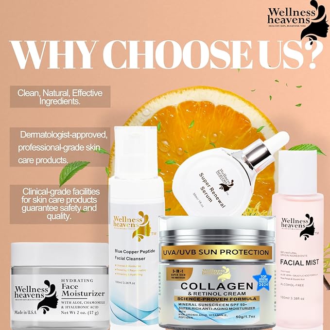 - { SIMPLIFY } Daily facial care with Wellness Heavens Collagen & Retinol Cream for Face with SPF. Our fine skin care formulation is enriched with potent anti-aging ingredients, including retinol, collagen, and hyaluronic acid, for the face. Our moisturizer helps combat signs of aging, preserves a youthful skin glow, and supports skin renewal and elasticity, visibly reducing fine lines and wrinkles while ensuring optimal, long-lasting hydration.