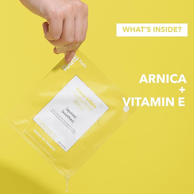 - Trésor Solaire Sheet Mask - RARE Paris Trésor Solaire facial sheet mask soothes and strengthens the skin barrier, helping your skin to recover all its comfort. Formulated with Vitamin E and Arnica, say goodbye to redness, feelings of discomfort, tightness and weakened skin. This sheet mask is available in a convenient pack of 1.