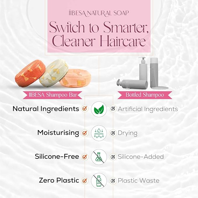 - Pure, Safe & Gentle Shampoo Bar Soap: Free from sulfates, parabens, artificial fragrances, and dyes, the IIBESA Natural Soap moisturizing shampoo bar is ideal for sensitive hair and scalps. Whether you are searching for a cleansing oily hair shampoo, dry hair shampoo, or curly hair shampoo, our natural hair shampoo bar will provide a soothing cleanse without harsh chemicals.