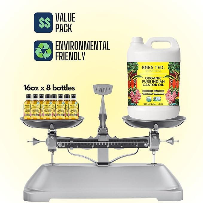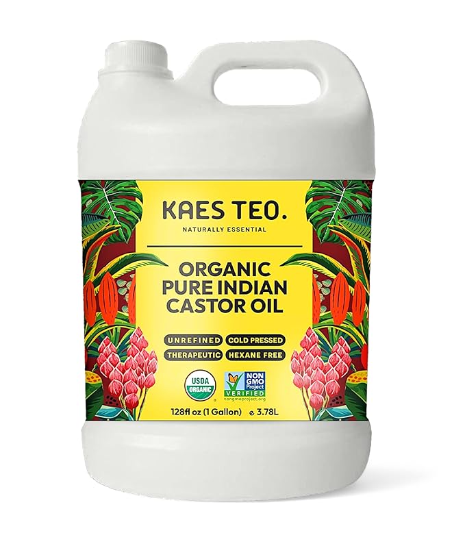 Organic Castor Oil 1 Gallon (128 fl oz) Bulk, 100% Pure Cold-Pressed, Hexane Free, Eyelash, Eyebrow & Hair Growth Serum, Skin Moisturizer, Massage, Hair Loss, Dandruff, Detox and Wraps