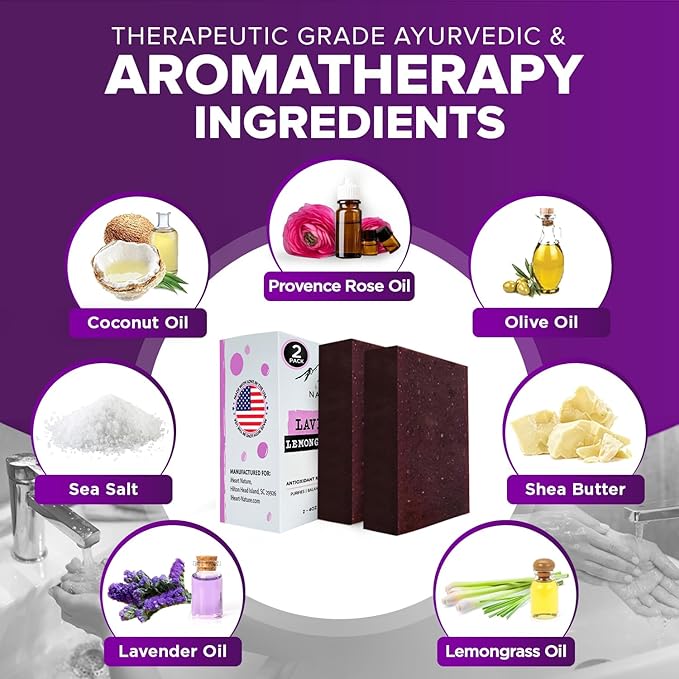 - Sea Salt soap gently exfoliates, removing impurities and dead skin for a smoother, radiant texture. Infused with Ayurvedic herbs, our Lavender Lemongrass soap soothes, rejuvenates, and detoxifies, leaving skin hydrated and radiant.