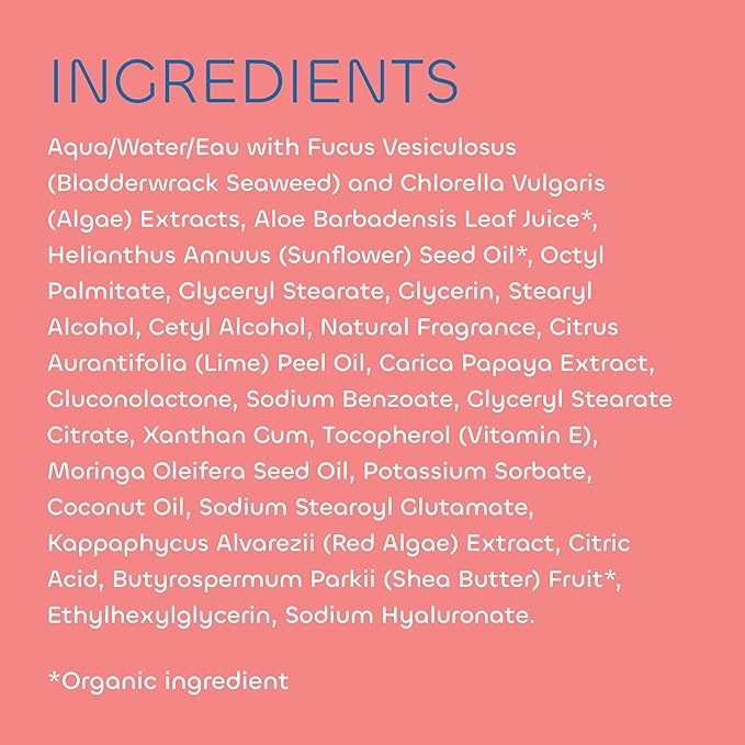 - All Day Hydration: With nutrient-rich Red Algae, restoring Moringa Oil and softening Shea Butter, our daily lotion quickly soaks in for healthier-looking skin without a greasy feeling