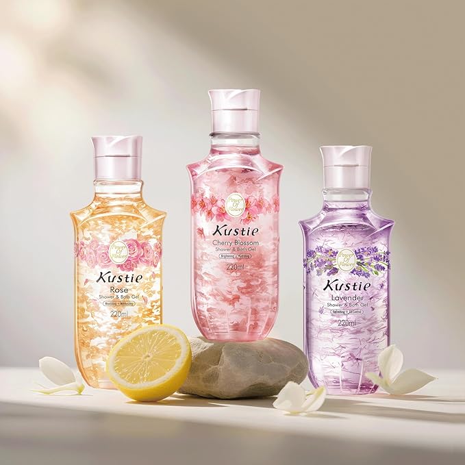 Kustie Lavender Petal Body Wash – 220ml Portable Shower Gel with Real Provence Petals & Tea Tree Oil – Antibacterial, Moisturizing, Anti-Acne, 24HR Floral Scent for Oily, Sensitive & Dry Skin