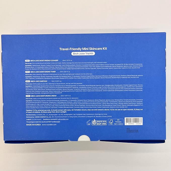 - [ALL-IN-ONE BESTSELLER KIT] Experience ROUND LAB’s most loved Birch Juice Moisturizing line in one essential mini Kit. Includes Cleanser 30ml, Toner 20ml, Serum 10ml, Cream 20ml for a hydration 4-step routine