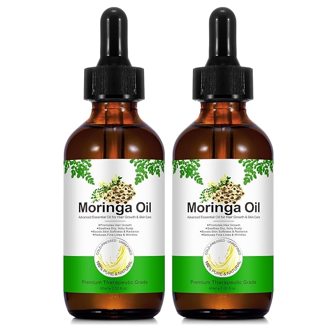 2Pack Moringa Oil 2.02 fl.oz, Pure Natural Organic Cold-Pressed Glass Bottle Moringa Oil for Hair Growth, Moringa Seed Oil for Face, Skin & Body Care, Anti-Aging, Nourish Hair, Scalp & Body Massage