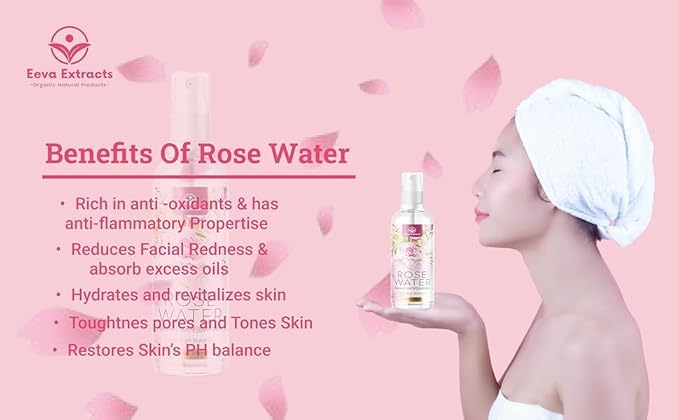 Eeva Extracts - Organic Rose Water I Natural Hydrates,Cleanses & Moisturises for Skin & Face I No Sulphate,Alcohol,&Parabens I pH Balancer I Facial Toner Spray I for Women & Men,100Ml