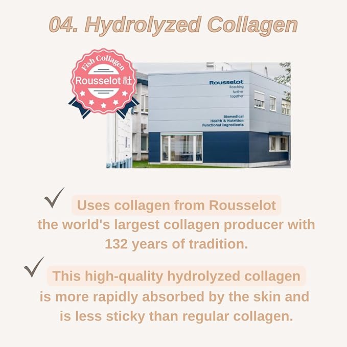 - Premium French Ingredients: Utilizes high-quality hydrolyzed collagen from Rousselot, a renowned French company with over 132 years of expertise, ensuring superior absorption and minimal stickiness.