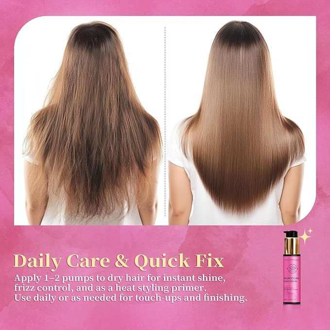 - Repairs & Strengthens Hair: This Moroccan hair serum Helps restore damaged, brittle, or color-treated hair by sealing split ends, taming frizz, and promoting smooth, silky strands.