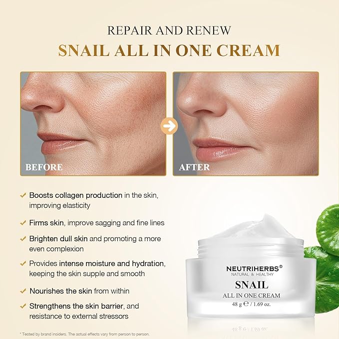 - 20πΏ πͺπππππππππππ π―ππ ππππππ & πΉπππππ -- Powered by 10% ethically harvested USA-sourced snail secretion filtrate, Neutriherbs Snail Mucin Face Cream delivers 20 times denser moisture, deeply repairing wrinkles, prevent environmental damage while boosting collagen for visibly plump, youthful skin.