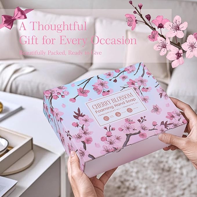 Cherry Blossom Foaming Hand Soap Refill Gift Set – 3 Pack*33.8 Fl Oz with Refillable Dispenser, Refreshing Floral Scent, Moisturizing & Chemical-Free for Bathroom, Kitchen, Sensitive Skin