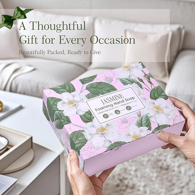 Natural Jasmine Foaming Hand Soap Refills 3-Pack (33.8 Fl Oz Each) with Dispenser - Plant-Based, Non-Toxic, Large Volume for Kitchen, Bathroom - Great Value Gift Set for Housewarming
