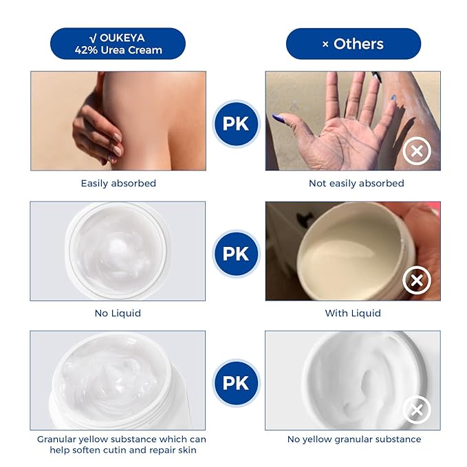 - 【Treatment for Feet】Uncomfortable shoes, a fast-paced life, and sports can lead to cracked and dry heels. With OUKEYA Urea 42% Foot Cream plus Salicylic Acid 2%, you can achieve soft feet in the easiest and quickest way possible. The perfect formula of the cream deeply moisturizes and softens your feet, providing relief from the pain and hassle of calluses while leaving your heels incredibly smooth.