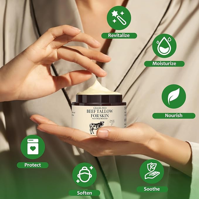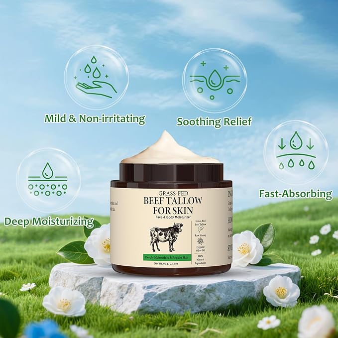 - Deep Nourishment & Elasticity Boost: Formulated with grass-fed beef tallow rich in vitamins A, D, E, and K, this beef tallow for skin deeply moisturizes and nourishes the skin. This tallow and honey balm helps improve elasticity and softness, leaving your skin smooth, supple, and noticeably refreshed after each use