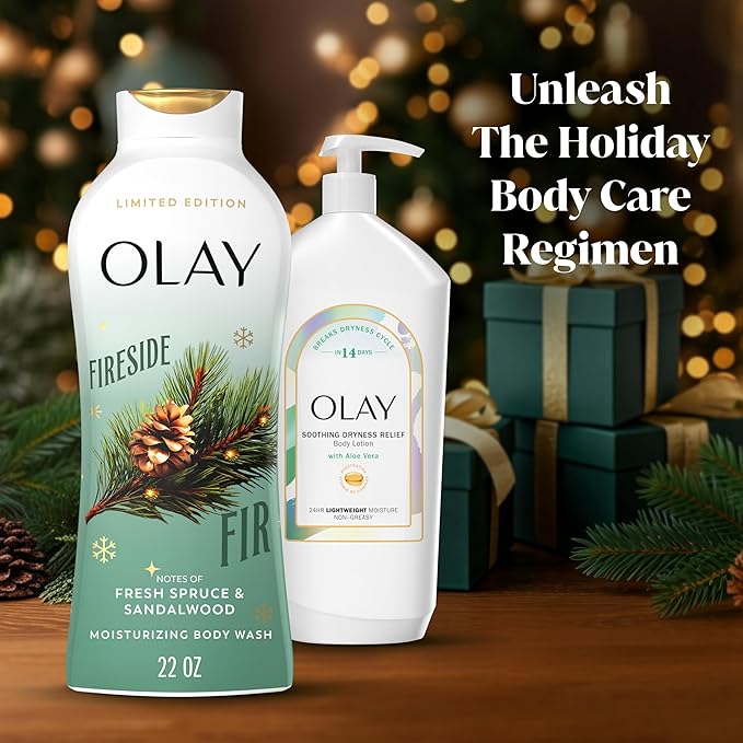 Olay Body Wash for Women, Hydrating & Moisturizing, Holiday Edition, With Plant Based Cleansers, B3 Complex, For All Skin Types, Fireside Fir with Fresh Spruce & Sandalwood Scent, 22 fl oz