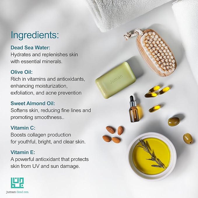 - Nourishing Benefits: Enriched with Dead Sea Water to restore mineral balance, Olive Oil for deep acne prevention, Sweet Almond Oil to smooth fine lines, Vitamin C to brighten skin, and Vitamin E to protect against UV damage and skin healing.