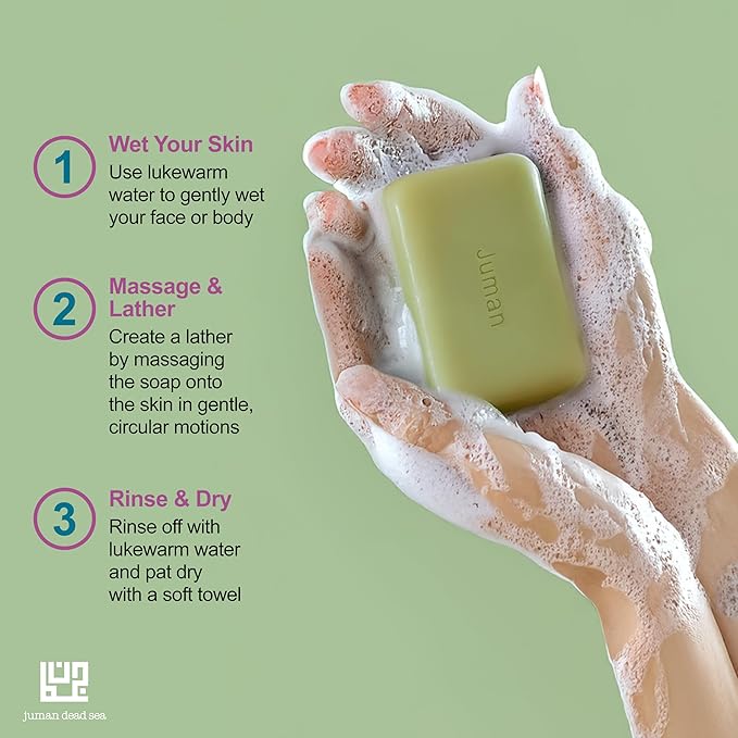 - Olive Oil Soap with Dead Sea Minerals: A luxurious blend of Olive Oil, Sweet Almond Oil, Dead Sea Water, Vitamin C, and Vitamin E to deeply moisturize, protect, and brighten the skin. Naturally green in color.