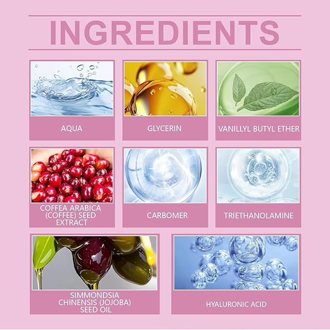 - Active Ingredients : Small fruit coffee seed extract, Jojoba seed oil, hyaluronic acid
